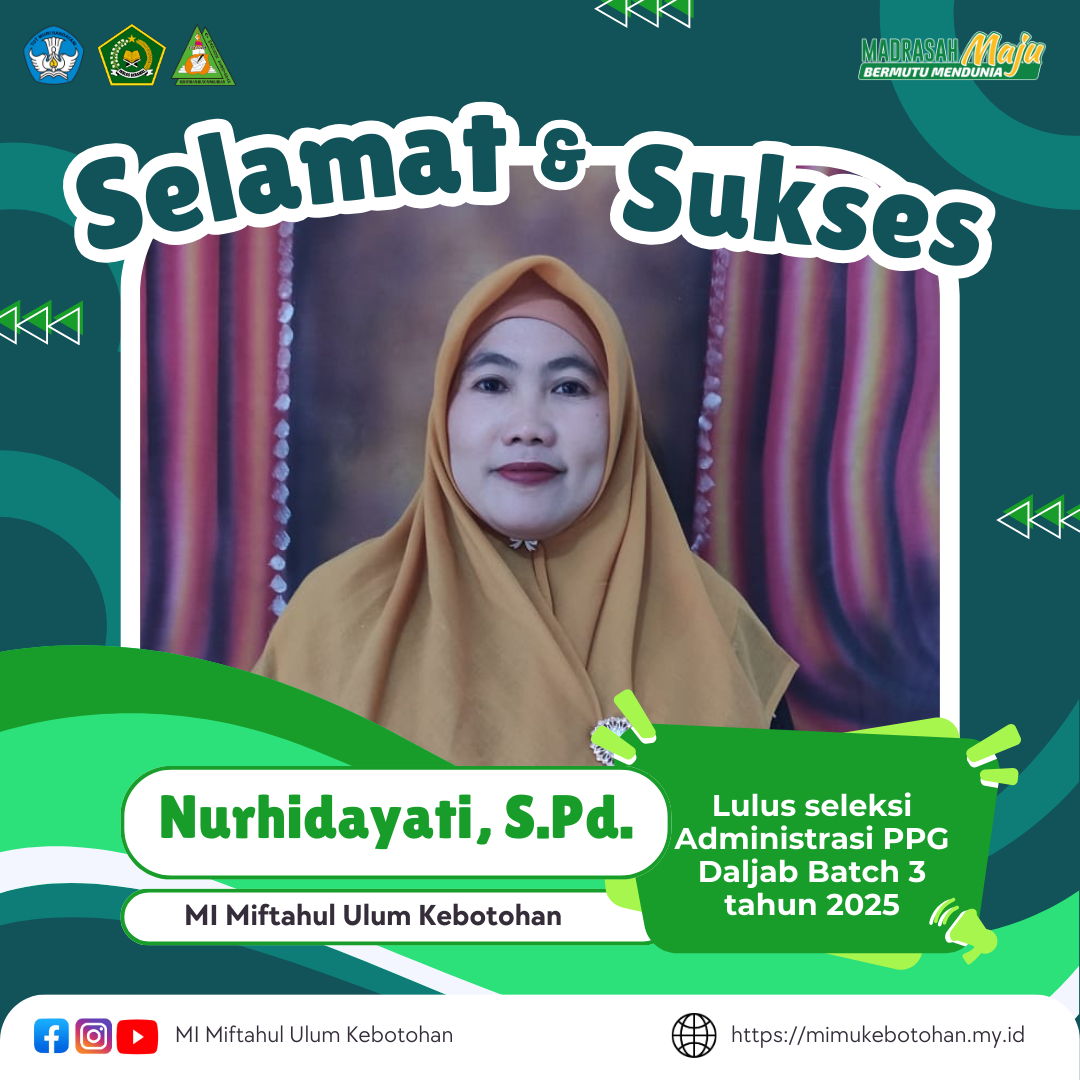 Madrasah Ibtidaiyah Miftahul Ulum Kebotohan dengan bangga menginformasikan bahwa satu guru dari madrasah kami berhasil masuk kuota PPG Dalam Jabatan (Daljab) 2025 Kementerian Agama Batch 3.
