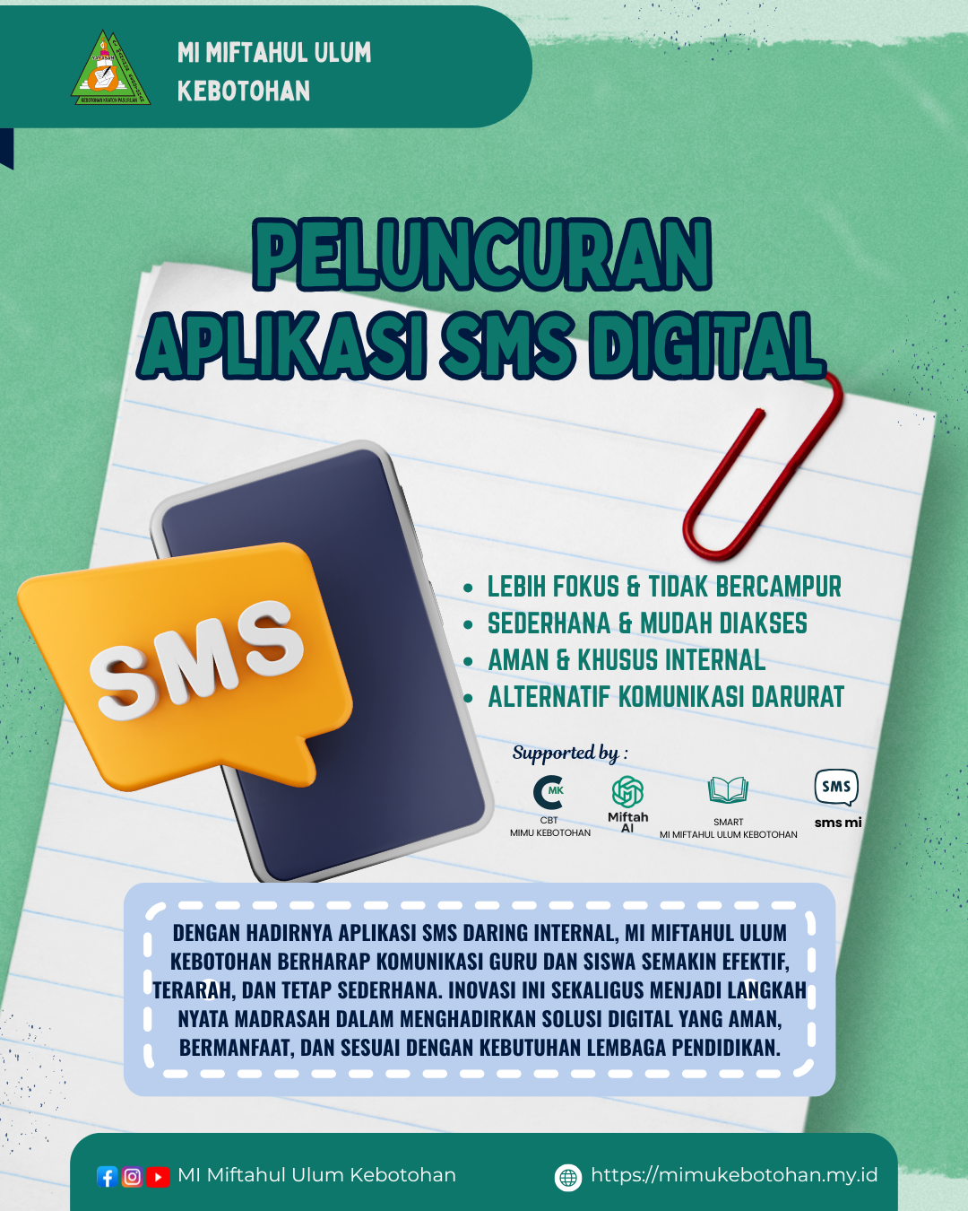 Sebagai bentuk inovasi dalam memperkuat komunikasi antara guru dan siswa, MI Miftahul Ulum Kebotohan kini meluncurkan Aplikasi SMS Daring Internal. Aplikasi ini dirancang khusus hanya untuk lingkungan madrasah, sehingga lebih fokus, aman, dan praktis digunakan sebagai sarana komunikasi resmi.