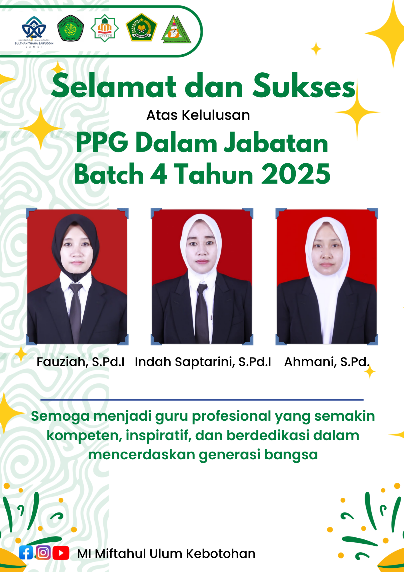 MI Miftahul Ulum Kebotohan dengan penuh rasa bangga dan syukur mengucapkan selamat dan sukses kepada tiga guru yang telah berhasil lulus dalam program Pendidikan Profesi Guru (PPG) Dalam Jabatan Batch 4 Tahun 2025.
